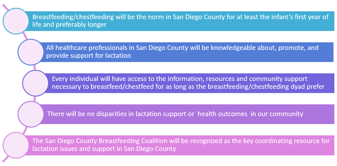 The San Diego County Breastfeeding Coalition’s mission is to improve the health and wellbeing of our community by protecting, promoting, and supporting breastfeeding through education, outreach, advocacy, and service.