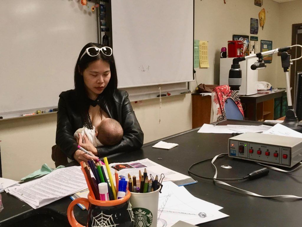 To-wen nursing son Jasper while subbing at a local school a few years ago (To-wen Tseng).