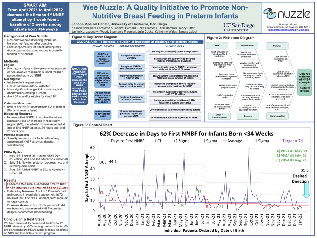 The objective of this Quality Improvement (QI) project is to decrease the time to first NNBF attempt by one week from a baseline of two weeks among infants <34 weeks, between May 2021 to May 2022. The global aim is to support and encourage breastfeeding, promote maternal-infant bonding, and facilitate early positive oral experiences.
